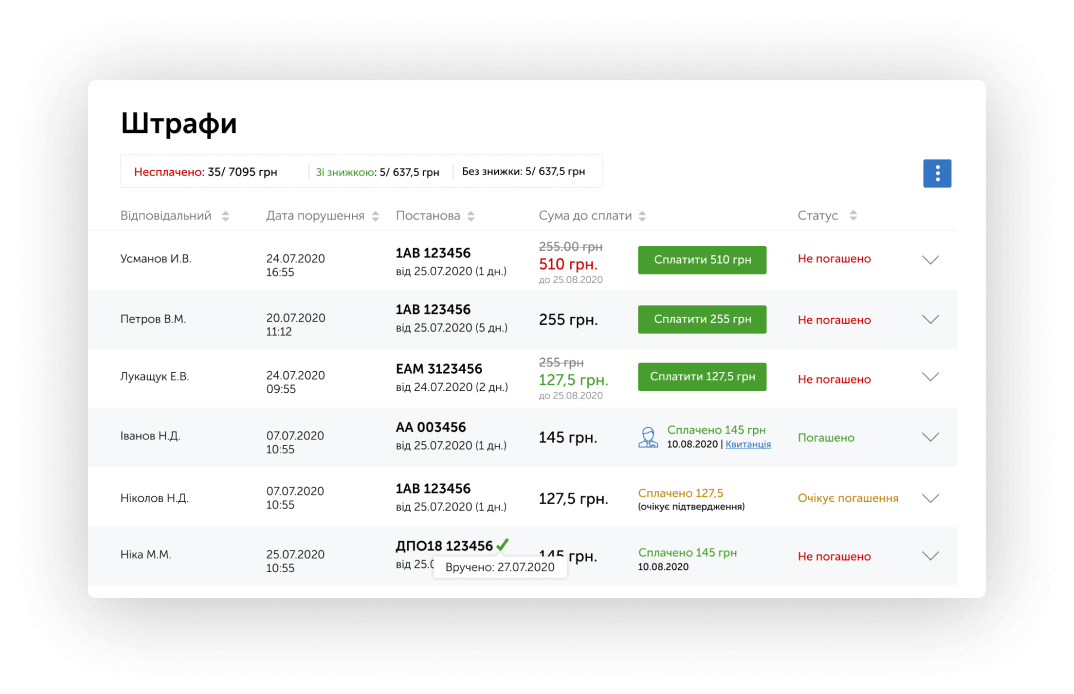 За допомогою сервісу Штрафи UA для бізнесу виконується перевірка, сплата та контроль штрафів з гарантією погашення.